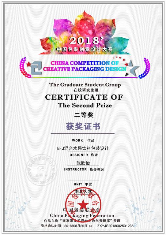 近日,“2018中国包装创意设计大赛”评比结果正式公布,此次大赛全国共有6876件作品角逐,经过了大赛严格和规范的评审程序以及初评、复评和终评三个环节。湖北大学艺术学院16级研究生张欣怡同学的设计作品荣获大赛二等奖以及第十二届“创意中国”设计大奖优秀奖,作品《BFJ混合水果饮料包装设计》入选“国家职业教育专业教学资源库”。
