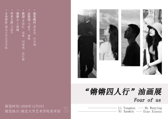 2020年12月9日上午,由湖北大学艺术学院主办的“锵锵四人行”硕士油画作品展开幕式在湖北大学艺术学院一楼大厅举行。展出四位青年艺术家肖晓玉、李童文、何婉莹、倪学敏油画作品。