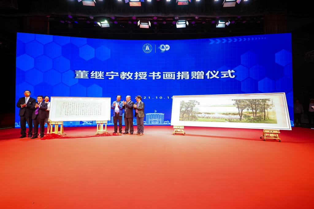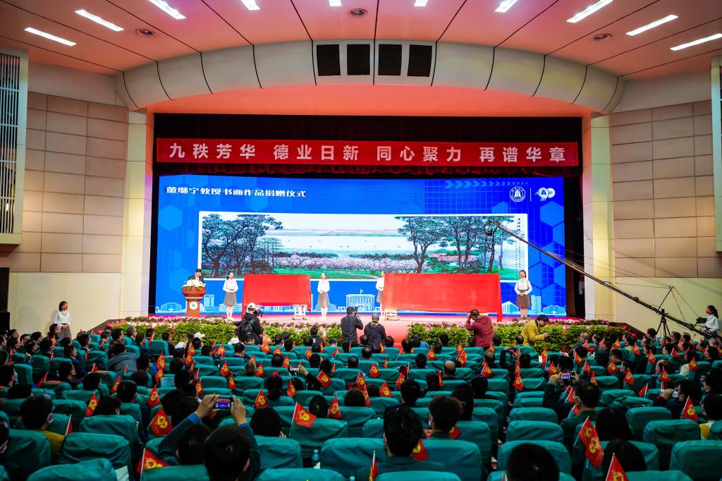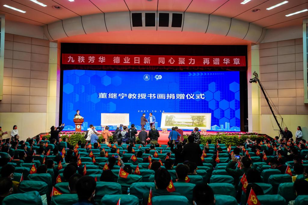 10月16日下午,学校在小礼堂举行董继宁教授书画作品捐赠仪式。校党委书记谢红星,校长刘建平,副校长蒋涛,副校长钱建国,武昌区领导,校友企业家代表出席仪式。刘建平代表学校接受董继宁教授为校庆特别创作的山水画作品《沙湖情怀》和书法作品《湖北大学校歌》,并为董继宁教授颁发收藏证书。