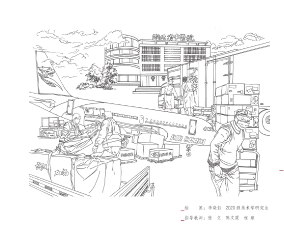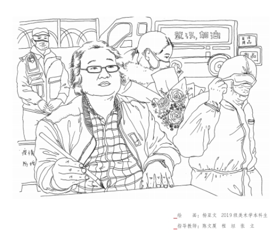 9位老师分成三组,带领50余名本科生、研究生,在十余天的紧张时间了,进行了90幅插图的设计,修改最多的同学五易其稿。同学们除了接受老师们的不定期分散指导,不同小组每个几天还会聚起来一起讨论和打磨图案。18级美术专业的李茜雅既是此次团队的参与者,又是书中的湖大抗疫人物,疫情期间也笔耕不辍地把以父亲为代表的宜昌警察抗疫形象用画笔记录和展示出来。在创作的过程中,虽然经历了高强度的赶稿磨稿工作,也再次受到湖大抗疫人、抗疫精神的教育。