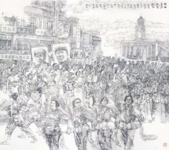 为了创作好这幅画作,谭老师不仅探究了众多文献资料,还搜集调阅当年几百幅老照片,画作场面波澜壮阔,生动再现了当年国立湖北师范学院学生喜迎解放军进城的震撼场景。