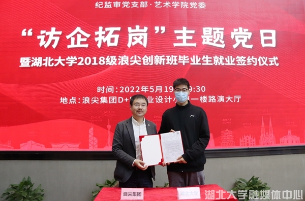 罗成与毕业生代表签订就业协议,欢迎更多湖大学子加入浪尖大家庭。他表示,将与湖北大学继续深化产学研合作,推进产教融合育人,让更多学科专业融入产业链,把浪尖创新班越办越好,打造工业设计人才培养新模式。