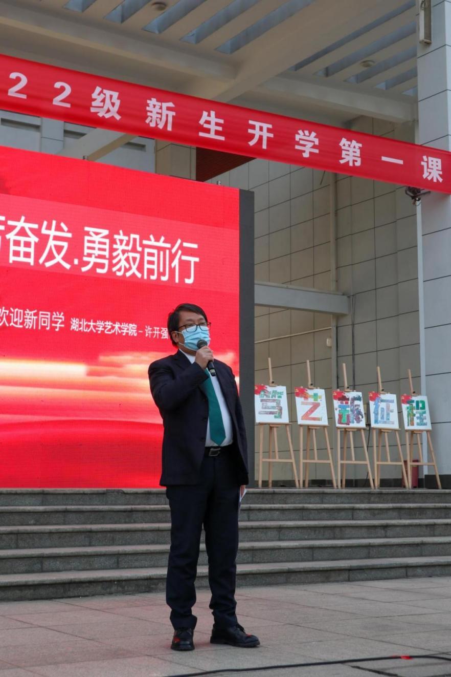 活动第五项,艺术学院院长许开强教授作“开学第一课”专题讲座。许院长强调,身为艺术学院的学生,要做到五个方面。第一,“德用兼立,学思并重”。要读书养心、劳作上手,善于认识美、发现美、创造美,融科技之真、人文之善、艺术之美为一炉。第二,学会独立,学会思考,学会共享。同学之间要团结友爱、互相帮助,达到群体大于个人的最优效应。第三,要掌握新方法、新手段、新技能。他表示,人类史就是一部创造史,在当今数字文明的时代,同学们要融合贯通,更好地成才。第四,坚持“四个追求”,即追求人生的高度,追求文化的宽度,追求学术的厚度,追求艺术的温度。第五,要有好目标、好追求、好定力、好身体、好本领。许院长现场展示了艺术学院相关专业师生、校友的优秀作品,鼓励同学们克服困难,勇毅前行,快乐学习,身心愉悦!