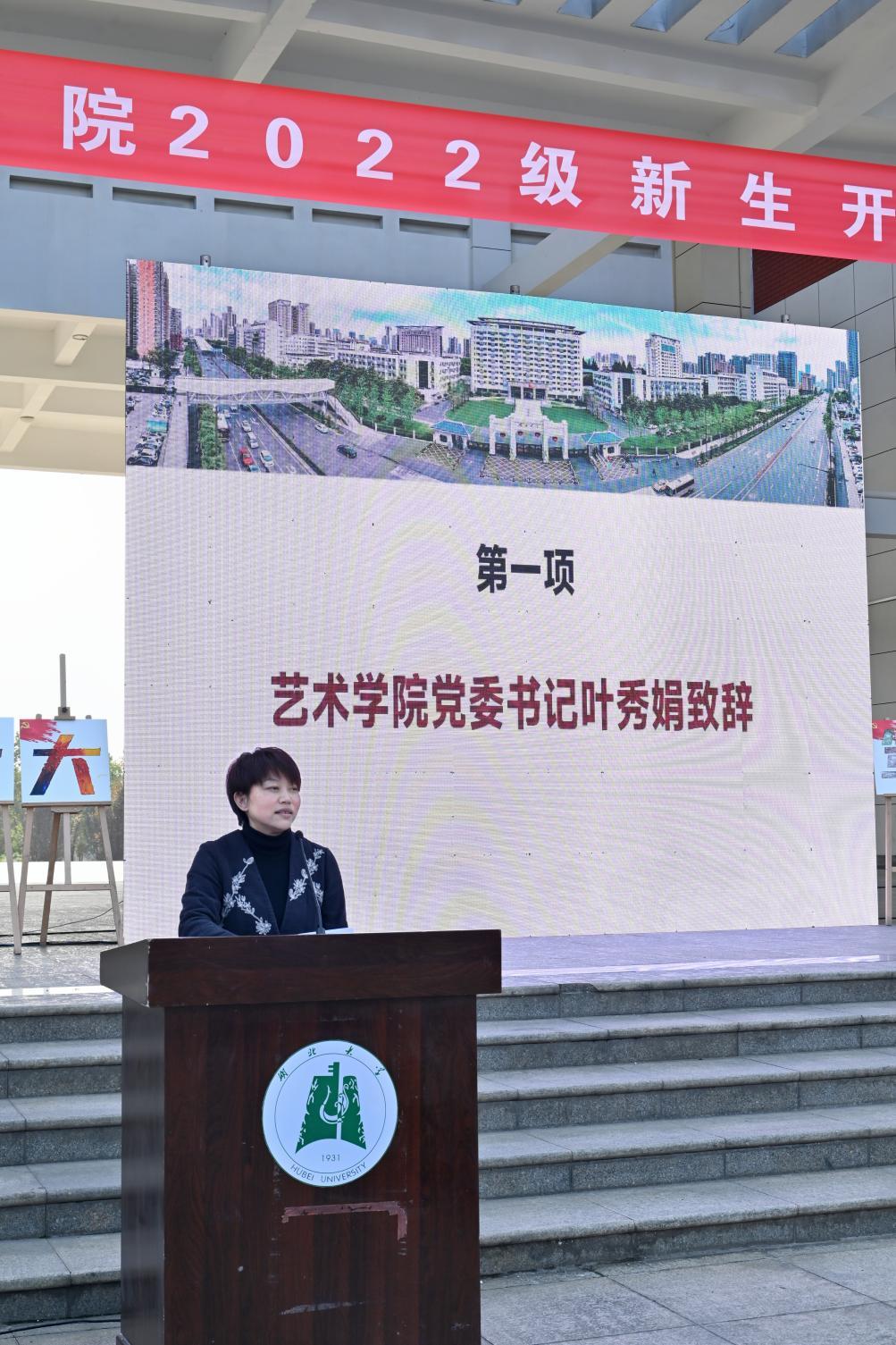 艺术学院党委书记叶秀娟首先致辞。她向2022级本科新生表示了热烈欢迎和美好祝福,从领航、起航、导航、护航教育四个方面对2022级新生入学教育活动方案进行了解读,并给同学们送上三点寄语:一是坚持理想融入时代,铸魂塑形;二是坚持理论统一实践,沉稳致远;三是坚持奋斗携手友谊,一路同行,希望同学们谨记习近平总书记对青年的嘱托,在求学之路奋发向上,做出自己的好成绩。