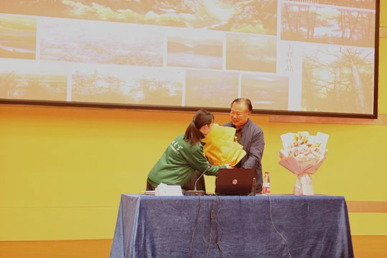 董继宁教授为楚才学院赠送画集,并在扉页题词“湖北大学楚才学院惠存”。楚才学院、艺术学院的同学们自发准备了花束献给董教授。讲座在鲜花与掌声中落下帷幕。
