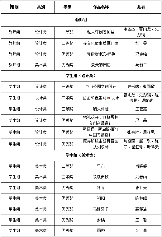 近日,湖北省文化和旅游厅、湖北省教育厅公示了《湖北高校第九届美术与设计大展获奖作品名单》,艺术学院师生共斩获17项奖项。此次比赛分为“设计类”、“摄影类”及“美术类”三条赛道,艺术学院师生共荣获一等奖2项、二等奖3项、三等奖2项、优秀奖10项,取得了优异成绩。其中,余孟杰老师团队创作的《私人订制酒包装》获得教师组设计类一等奖,史彤瑞、曹雨欣同学创作的《中山公园文创设计》获得学生组设计类一等奖。