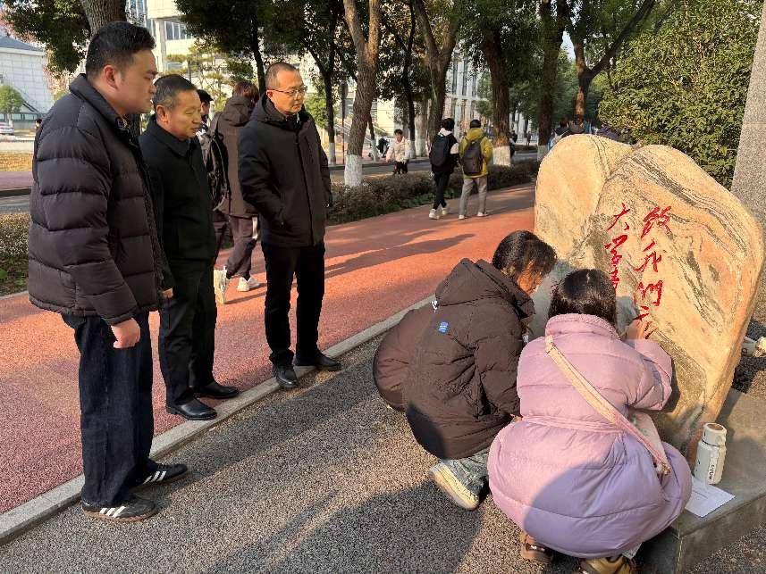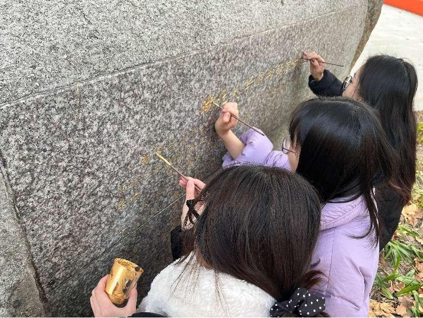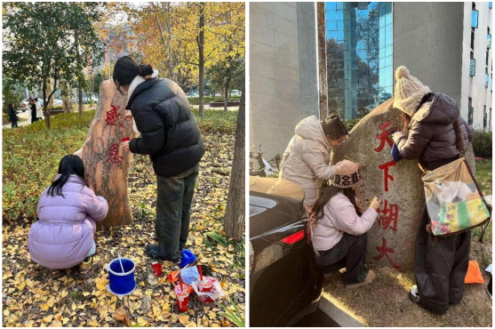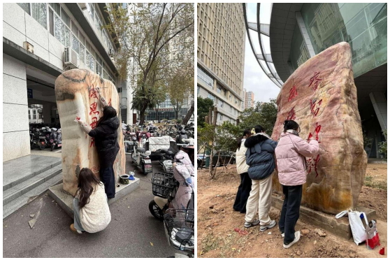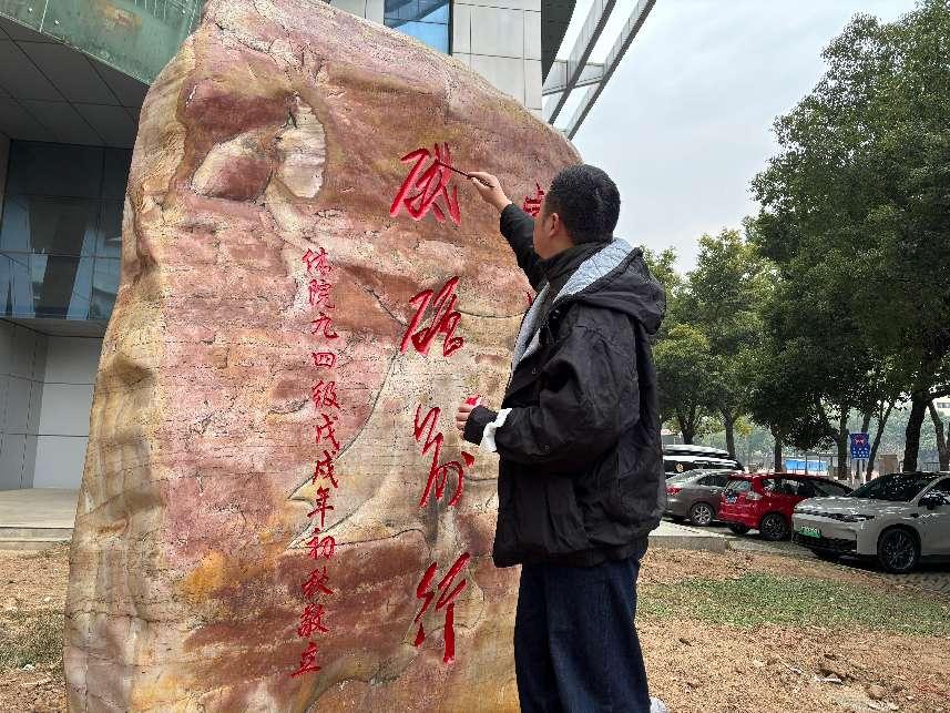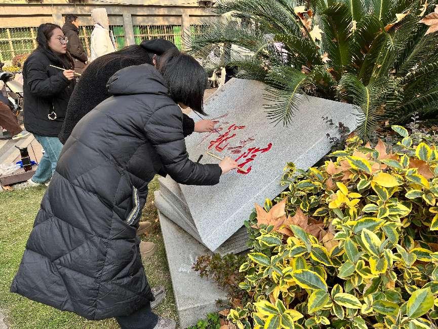 随形赋彩,金石为开,碑以载字,字赋情怀!为贯彻落实党的二十大精神和习近平文化思想,以高水平党建引领校园精神文明建设,构建学院“党建+三全育人+五育并举”的融合育人体系,为学校高质量发展提质铸魂。12月20-27日,在学校党委宣传部指导下,艺术与设计学院学生(本科)绘画党支部和学院研究生第一党支部党员在冬日校园里开展了一场以 “随形赋彩·金石为开”为主题的党日活动,为分布在校园各处的文化石重新绘彩增色,旨在传承校园文化,续写校园文脉,彰显校园精神。