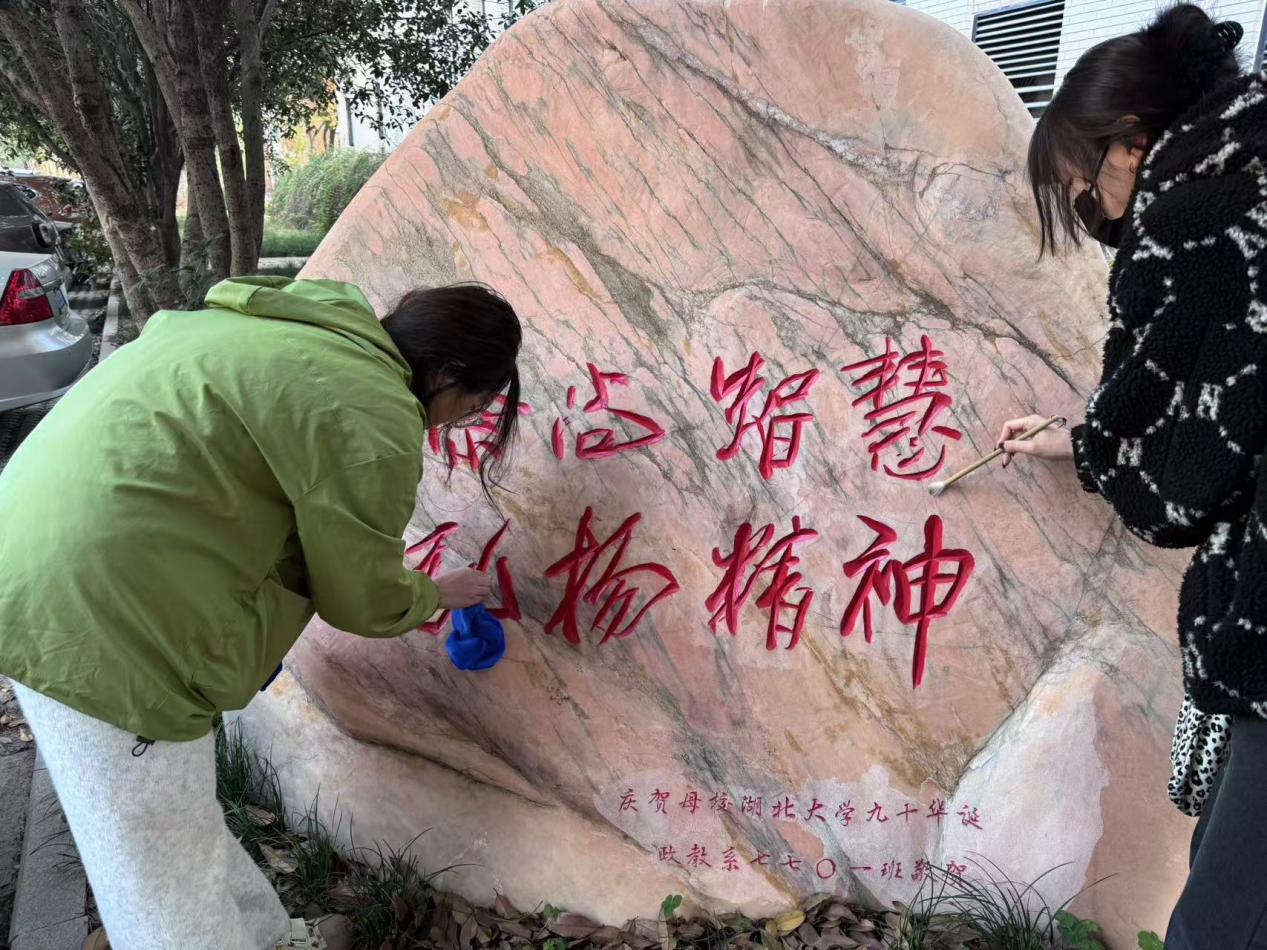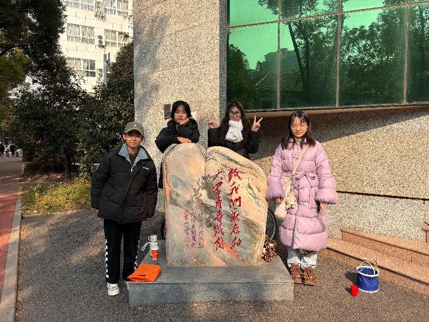 赋彩团队由艺术与设计学院研究生党员、本科生党员、入党积极分子等学生骨干组成,我院学生(本科)绘画党支部书记、学工办主任许诩担任指导老师。在许诩老师的带领下,团队成员在前期分小组对学校14组文化石进行了实地考察调研并做了细致的情况备注和拟修复措施,经过集中讨论和交流,最终确定每一块文化石的赋彩方式。在实践过程中团队成员们充分发挥自身专业优势,“擦拭”、“清理”、“勾摹”、“赋色”,从文字局部到石面整体,每一个环节都认真对待,一笔一画之间加深了同学们对于学校发展历史和底蕴文化的认识和了解。