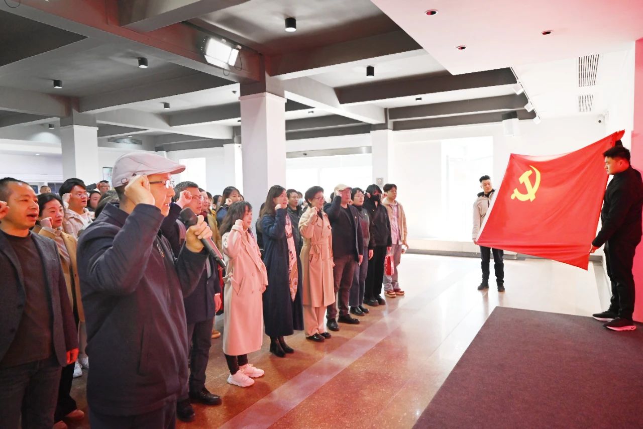 活动伊始,在省美术院党委书记李和清带领下,全体党员面向鲜红党旗,高举右拳,重温入党誓词。“我志愿加入中国共产党……”铿锵有力的誓言在馆内久久回荡,让每一位党员再次深刻领悟党的初心使命,坚定为党的艺术事业奋斗理想信念。