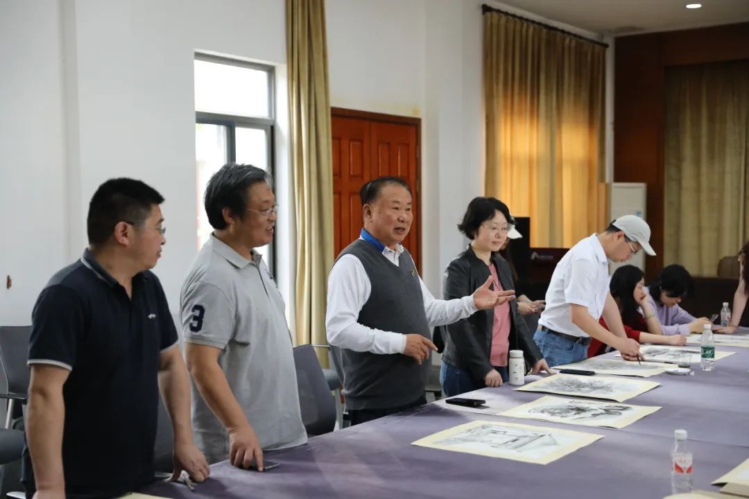 写生结束,董继宁教授与工作站负责人谭崇正、进站教师邓鸿涛、张立、王文印等围坐一堂,针对每幅作品的构图、笔墨与意境展开深入探讨。既肯定青年学子的创新勇气,也提醒其在传统与现代之间寻找绘画的语言,在技法与思想之间追求共鸣。墨香与智慧交织,艺术的火种在交流中传递。