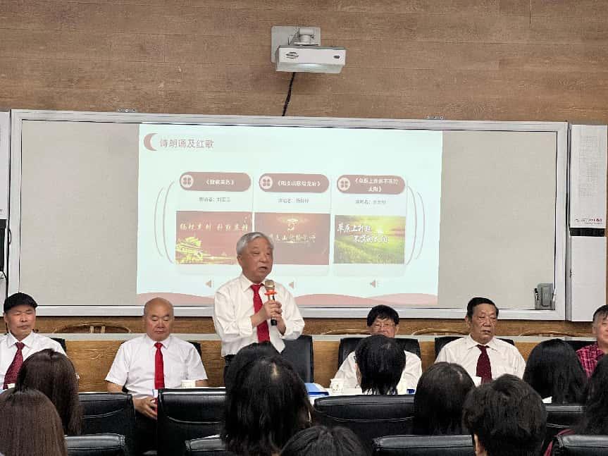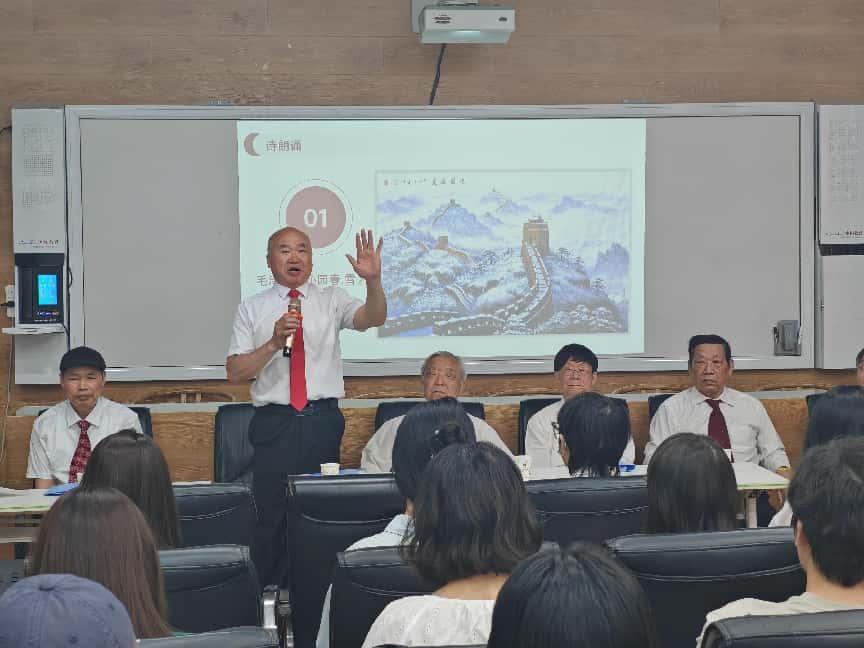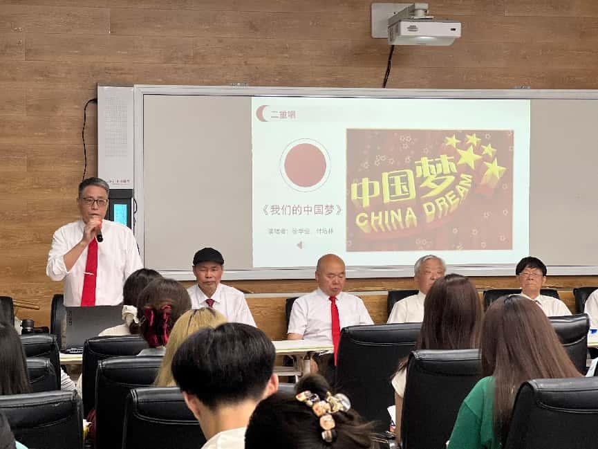 老教授们以诗朗诵《沁园春 雪》开头,回顾中国共产党领导的抗日战争、解放战争取得胜利过程中的重大历史事件,以理论+音乐+朗诵的多元教学方式,讲授中国共产党从新中国成立前挺起脊梁、奋起抗争,到新中国成立后独立自主、复兴伟业的历史征程,激励新时代青年挺膺担当、不负历史使命。《大刀进行曲》《太行山上》《雁南飞》《弹起我心爱的土琵琶》《游击队之歌》《致敬英烈》《唱支山歌给党听》《草原上升起不落的太阳》《我们的中国梦》......一阵阵熟悉的经典旋律响起,徐学俊,刘康义,刘刚,李文川,郑泽厚,郑玉美,刘爱玉,杨玲玲,薛小桥等离退休老同志进行朗诵及演唱。特别是87岁高龄的郑泽厚老师曲调高昂,容光焕发不输少年,令学生们敬佩。