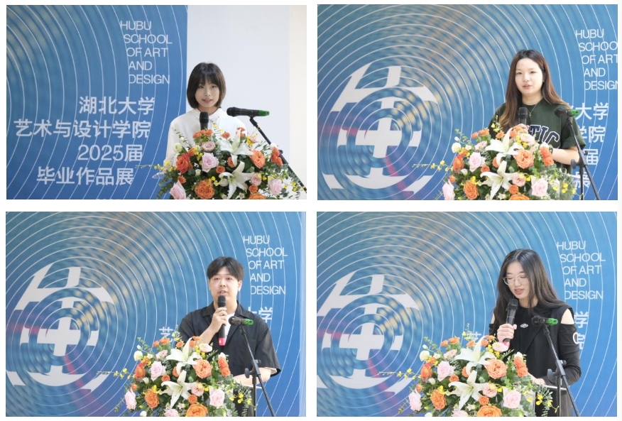优秀毕业生代表发言环节,姚晶(2021级环境设计)回顾了在校学习期间斩获多项赛事荣誉,综测名列前茅的奋斗历程,感恩母校培育并承诺以湖大精神继续追求卓越;徐珂(2021级产品设计)从深夜打磨模型的经历出发,谈到“设计是对问题的敬畏与价值的坚守”,致敬老师以人文理念点亮设计初心;郭佳颖(2021级数字媒体艺术)分享了从迷茫到坚定的蜕变,感谢母校提供的实践平台与师友的扶持,铭记“用温度做设计”的使命;祝玉瑛(2021级视觉传达设计)以品牌设计项目为例,诠释“设计源于生活观察与细节执着”,誓言携湖大烙印在艺术路上勇毅前行。四位同学的发言真挚动人,展现了毕业生们对艺术设计的热爱与对未来的憧憬。