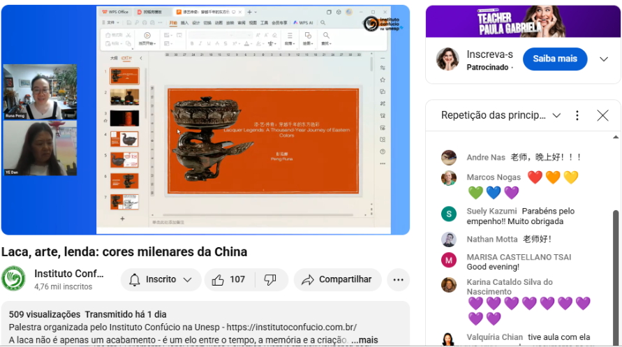 5月10日晚,湖北大学-巴西圣保罗州立大学孔子学院举办了一场以《漆∙艺∙传奇:穿越千年的东方色彩》为主题的讲座,吸引了500多名线上观众参与。讲座主讲人彭茹娜是湖北大学艺术与设计学院副教授、湖北大学大漆研究与国际传播中心主任,也是湖北省文联中青年优秀文艺人才、湖北省民间文艺家协会工艺美术委员会副主任和湖北省民间工艺美术特殊技能传承人。