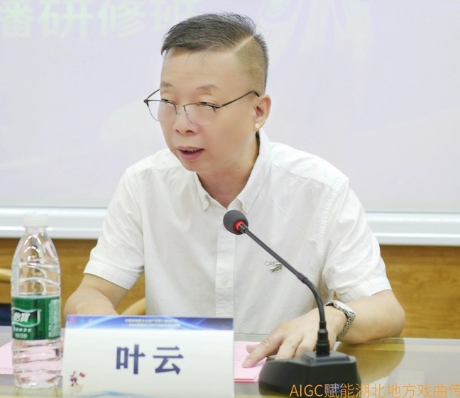 学院院长叶云教授发言,他表示非物质文化遗产是民族文化生生不息的精神根脉,是文化瑰宝。现在,以人工智能生成内容(AIGC)为代表的新兴技术迅猛发展,深刻改变着信息传播与艺术创作的形态,为传统戏曲的传承传播既带来了挑战,又带来了机遇。湖北大学艺术与设计学院多年来始终致力于推动艺术与科技的融合创新,并取得了诸多重大成果。因此,学院将积极发挥各方面资源优势,助力项目的顺利实施与完成。同时,他对参与培训的学员寄予了厚望。