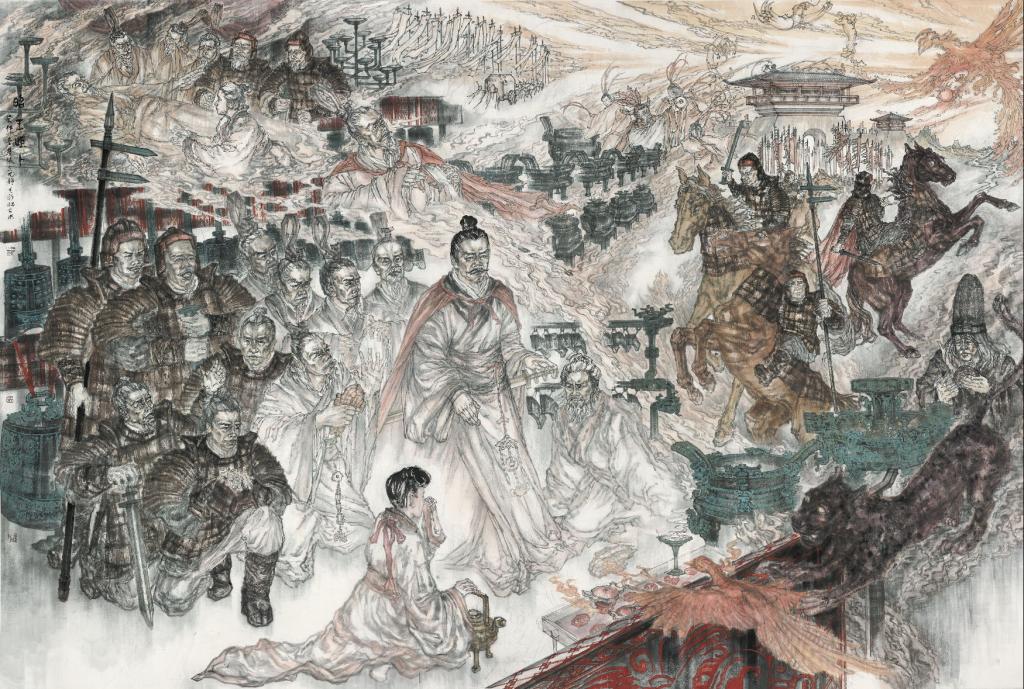 作品简介:《昭王拒卜》题材来源于楚国中兴之主楚昭王命终的典故记载。楚昭王二十七年,楚昭王救助陈国抗击吴军,驻军在城父。十月,昭王病倒在军中。连续三日落日时红色云霞象鸟一样,围绕太阳飞翔。昭王将此天象向周太史询问吉凶,回复卦象对楚王有害,把灾祸移到将相身上,王可免灾。将相请求替王受灾,昭王认为将相如同我的手足,昭王不同意。再次占卜病因为黄河在作祟,大夫们请求祭祀黄河神。昭王也拒绝了。后昭王将死,托公子启继王位,启假意受命,昭王死。本作品围绕着楚国中兴之主楚昭王行将去世的故事展开:1落日火凤异象,2请巫卜卦祈祷、3王拒转祸于臣、4王拒祭河神、5命终归太虚。作品用环形结构窜起故事5个片段。环形启点与终点交汇于日落天象。其中以凤鸟、黑豹、龟甲、大雁等动物形象、变幻于火焰、云雾之中,增强楚国占卜的神秘色彩,反映了人们对未知世界的探求和对命运的关注。画中人物从惊惧-愁忧-悲绝-怅茫的情绪变化来表现故事发展。体现中国人生命往复的朴素自然观。“昭王拒卜”典故是一首悲伤的英雄幕落之歌,孔子评价此事为“楚昭王通大道矣。”昭王拒卜故事包含了古代中国的君之德、臣之义、生死之道。为了表现循环往复的自然变化,画以云、火元素的变形穿插于主结构线中,暗示故事发展,渲染一代君王日暮之气。画面前景主体为君臣环绕的人物组像,表现楚昭王得知占卜结果之时,群臣围绕议论劝说,昭王拒绝太史公和巫师的提议,笃定面对天道生死的情景。画面远景部分昭王病逝、扶灵回乡,云腾星现,大雁南回。色调以灰调子为主,前景厚重、后景轻虚,整体墨色暗沉,色彩灰淡,展现一代楚王落幕的悲伤场景。