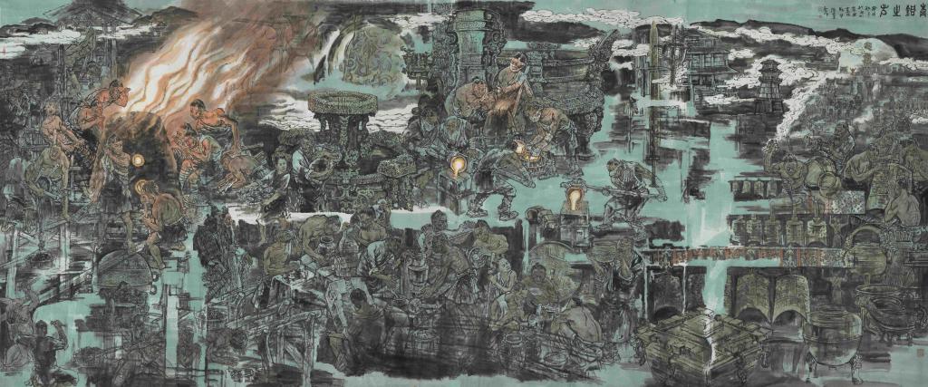 作品简介:在先秦时期,青铜不仅是制作冷兵器上好的材料,也是国家财富和实力的象征,是祭祀中与神对话的工具,也诸侯中称霸的资本。楚国意识到要发展、要称霸,不能没有青铜。于是坚持“筚路蓝缕,以启山林”,以铜立国,致楚国国力大增。历代楚王利用积蓄的强大青铜资源铸造的精良兵器,攻灭附近的庸国,使楚国势力向西北扩展。最终,“饮马黄河”,“问鼎中原”,楚庄王实现了先祖称霸诸侯的愿望。楚国青铜器制作工艺非常高超,制作器型多种多样,审美上也与中原青铜器有很明显的差异,皆以繁复多变为美,以俊秀柔和为美,以自由奔放为美,留下了数量巨大、种类繁多的国之瑰宝,是中华民族青铜时代最重要的组成部分。作品《青铜文明》以青铜的发现、开釆、冶炼、成型和运用为线索展开,以现主义手法深入刻画了尊盘、越王勾践剑、王子午鼎、编钟等几十个实物青铜器个性特征,画幅左边一炉火烧出了灿烂的青铜时代璀璨夺目的中华文明。是国家提出对传统文化要创造性转换和创新性发展的具体体现。