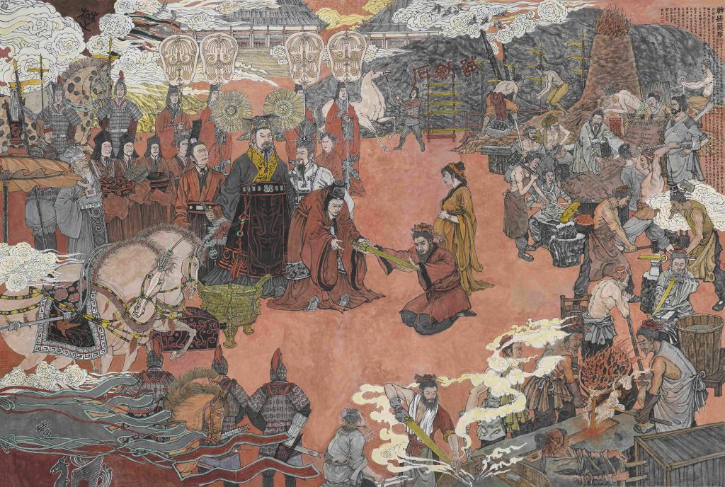 作品简介:干将莫邪是古代中国神话传说,最早出自出汉代刘向《列士传》和《孝子传》中,如今,最流行的版本为志怪小说集《搜神记》中所记干将莫邪的故事。干将,春秋时吴国人,是在楚国工作的最有名的铁匠,他打造的剑锋利无比。曾与其妻莫邪奉命为楚王铸剑,剑成两把,一曰干将,一曰莫邪(也作镆铘)。他知楚王性格乖戾,特先将雄剑托付其妻传给其子防备,后将雌剑献于楚王,后果真被楚王所杀。其子成人后成功完成父亲遗愿,将楚王杀死,为父报仇。该故事内容丰富,情节跌宕起伏,可歌可泣,赞颂了剑工高超的技艺和少年的壮烈,批判了古代统治者的残暴。本作品根据故事内容构思,以史诗般宏大的叙事方式描绘了楚王带众随从到铸剑坊视察验收工作,干将莫邪献剑的视觉形象。作品用楚王的亲临和宏大的皇家仪仗展现楚王对干将莫邪的重视。在表现铸剑坊时力求通过冶炼矿石、研发铸剑样式、锤炼、淬火、磨剑等场面,呈现众人热火朝天铸剑的工作状态。由此展现我国春秋战国时代精湛的青铜冶炼技术和干将莫邪独步青云的造剑水平,激发观众对楚国文化的浓厚兴趣,弘扬中华传统文化。该作品采用了“O”形构图,在黄金分割点的位置安排干将莫邪的形象。造型上人物、鞍马均采用意象性造型,采用工笔重彩勾线设色效果。手法上采用“现实主义+浪漫主义”,使得情节既真实可信,又具有楚风浪漫特质。