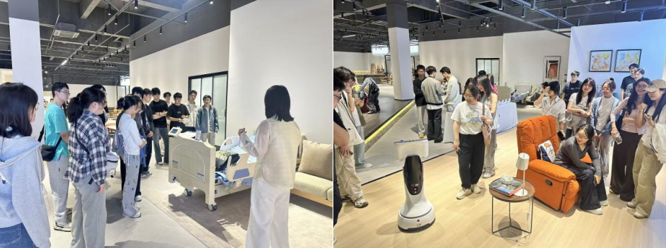 期间,在公司总负责人的引导下,师生们有序进行家具区、老年健康监测区、AI睡眠研发和低空载人飞行器的研发展示区域进行实地参观。AI睡眠研究负责人向师生重点展示了为养老院设计的一款智能床具,讲解了该产品的智能检测设计和调节使用并让师生们亲身体验了零压床垫的效果。结合学生的实时行为和体验效果以及数字界面的数据分析,展现了该智能床垫的主设计点和卖点。最后,师生们还参观了刚刚参国博展会的低空飞行地面展示机。直观的近距离接触低空载人飞行器引得现场师生频频驻足观察,拍照记录。“这款飞行器的载重极限是多少?”“在救援场景中如何停放?”“这款低空飞行器与救援直升机的区别在哪里?”同学们不禁提出了相关专业问题,低空飞行负责人结合实际和具体的数据说明进行了解答。