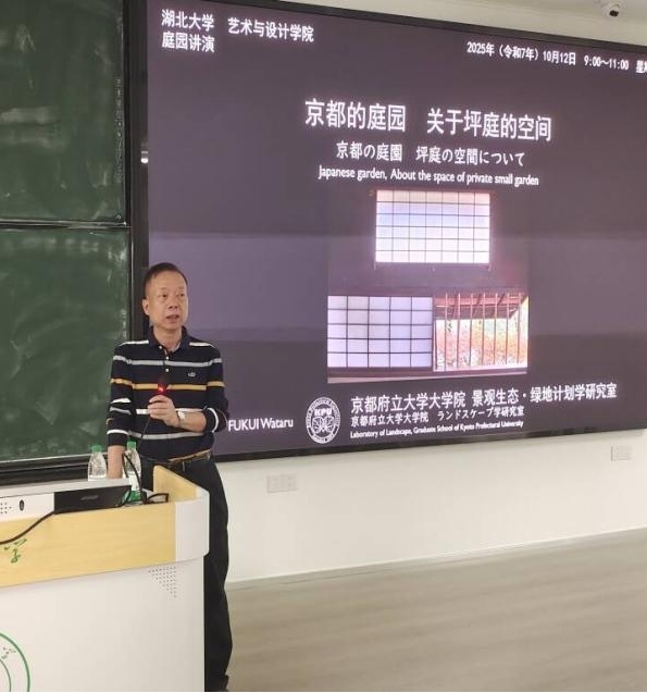 10月12日上午9时,4—407教室座无虚席,日本京都府立大学福井亘教授应邀为艺术与设计学院2025级全体本科新生、部分研究生和教师带来《京都的庭院・坪庭的空间设计》专题讲座。讲座由龙元教授担任学术主持,叶云院长致开场词,章倩砺、张国刚、周爽,向垚等教师共同出席,现场师生互动频繁,学术氛围浓厚。