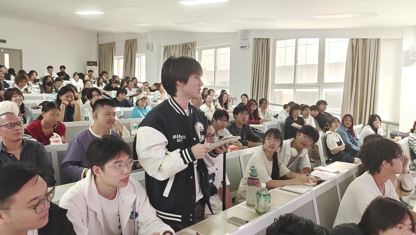 龙元教授的翻译精准传递了专业术语与文化内涵,不仅将 “地割”“借景”等造园技法的精髓生动诠释,更在讲解“天地连接”设计时,结合中国古典园林“虽由人作,宛自天开”的理念进行对照,使跨语言、跨文化的设计交流无缝衔接。在互动环节,新生围绕“现代小户型如何借鉴坪庭的借景手法”“为何日式庭院更加注重地面铺装的运用”等问题踊跃提问,福井教授结合大德寺方丈庭园中的以枯山水代水池实现天地呼应、卧龙桥畔庭园的借河道景观拓展空间、平安神宫庭园的以水池倒映朱红色建筑等,实例逐一解答,强调“设计需扎根场地特性,用远景拉开阔度、近景筑细节、水池连天地,才能让庭院成为自然的延伸”。