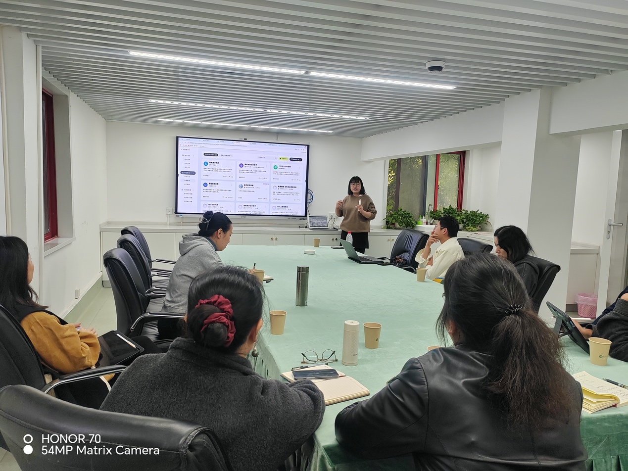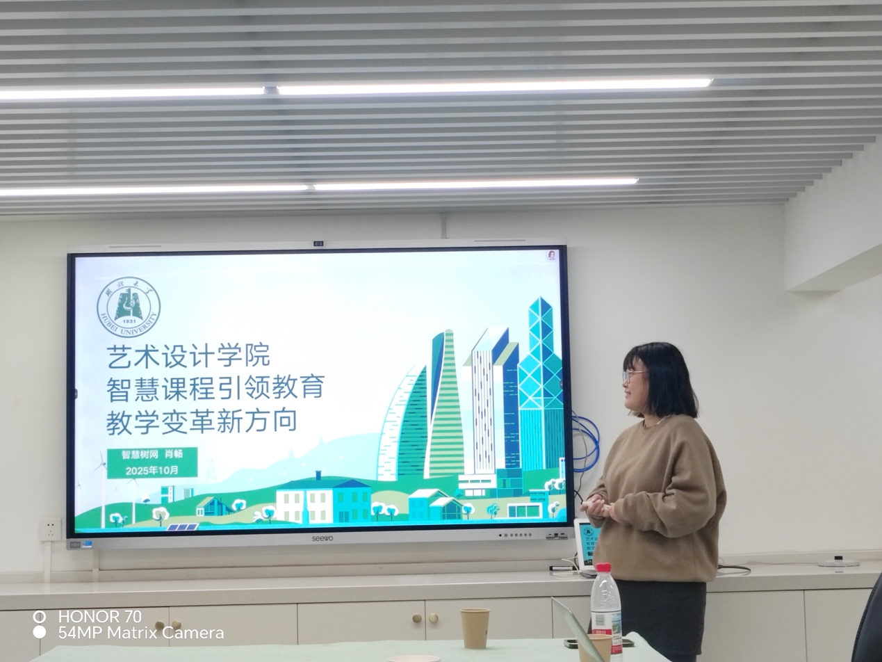 2025年10月24日中午11时,艺术与设计学院在学院小会议室举办了以“智慧课程引领教学改革新方向”为主题的专题研讨会,旨在推动学院智慧课程建设以及信息技术与教育教学的深度融合,探索未来艺术设计教育的新模式。研讨会学院教学办组织实施,邀请智慧树网资深培训师肖畅担任主讲嘉宾。艺术与设计学院院长叶云、各专业骨干教师参加了会议。