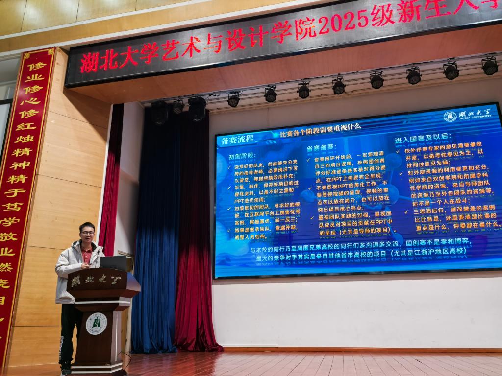 10月24日下午,湖北大学艺术与设计学院在三号楼学术报告厅成功举办了2025级新生入学教育系列活动。本次活动以“艺启创·智汇未来”为主题,聚焦艺术与设计领域创新创业教育,旨在引导新生树立创新意识、激发创业热情,为未来学业发展与职业规划奠定坚实基础。创新创业学院院长夏晓红、院党委副书记谈玉婷、学院辅导员、中国国际大学生创新大赛获奖代表以及2025级全体新生共同参与活动。