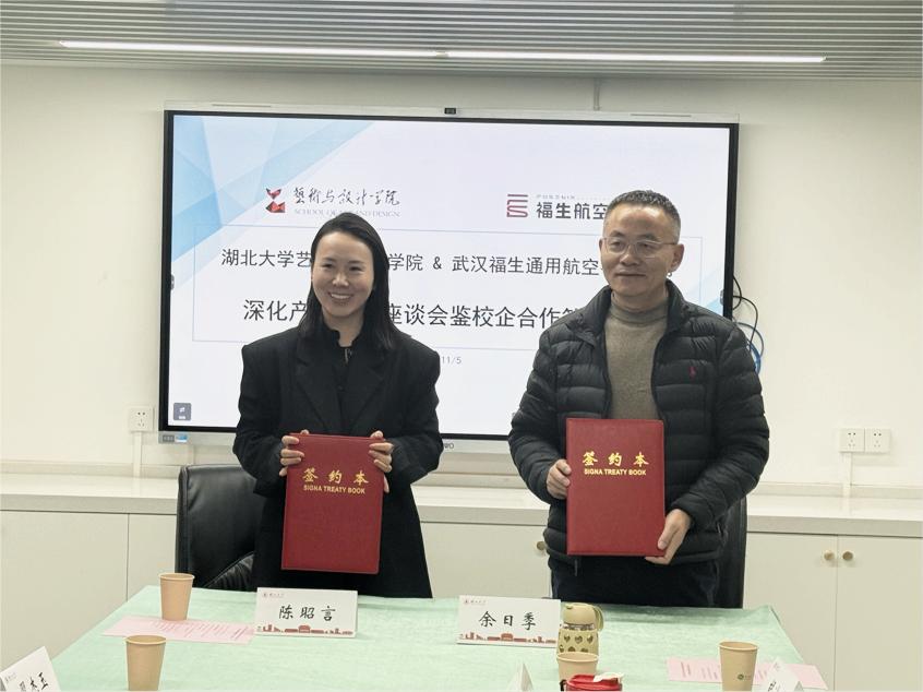 近日,湖北大学艺术与设计学院与武汉福生通用航空有限公司校企合作座谈会暨签约仪式成功举行。我院余日季副院长、王红主任、刘慧、刘光远、胡冰洁老师出席,武汉福生公司董事长陈昭言女士率设计总监翟杰玉、技术总监陈东东、行政总监孙娜以及黄浩教授代表参会。