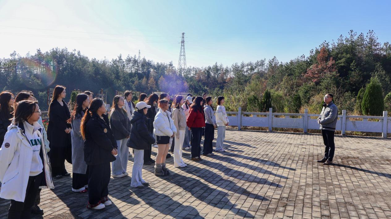 “瞻仰·励志致远”阶段,师生前往蔡家畈村烈士陵园、萧伯唐烈士纪念馆。湖北大学驻英山县石头咀镇冯家畈村工作队队长袁勋结合“大别山精神”的系统化研究、学理化阐释、学术化表达从历史、理论、实践等多个维度介绍大别山精神的由来源起与时代脉动,号召同学们利用专业所学做好“大别山精神”的当代诠释与形象运用。