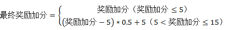 加分在5分及以下的不进行折算,加分超过5分的将超过5分部分×0.5然后再加上5分作为奖励分的最终得分。奖励加分项目最高上限为20分。