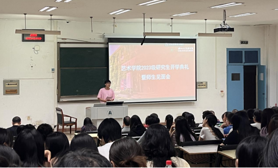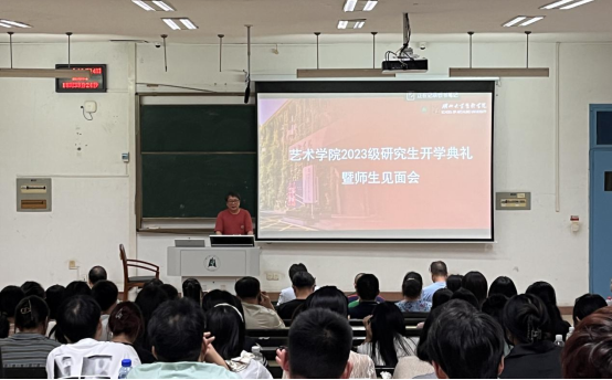 2023级新生王鲁阳、邓诗怡作为学生代表,分享了他们的经历与对即将开始的研究生生活的思考、期望。环艺专业的王鲁阳同学说,站在新的学习起点,面向新的赶考之路,我们艺院学子更要踔厉奋发、勇毅前行。希望我们珍惜学习机会,在学思践悟中涵养专业技能,做“奋斗者”;希望我们勇于锐意进取,在设计实践中练就过硬本领,做“开拓者”;希望我们牢记艺院精神,在德用兼立中做到学思并用,做“追梦者”。