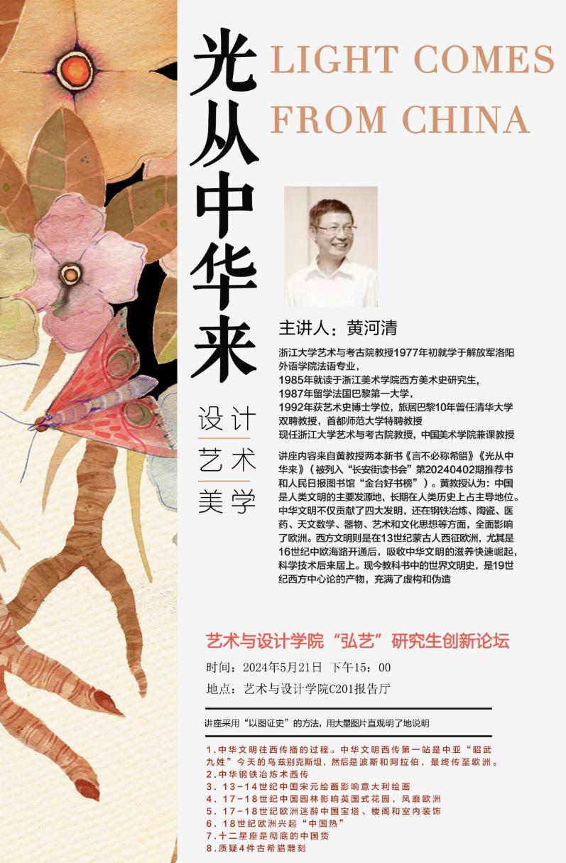 2024年5月21日下午15时,浙江大学艺术与考古学院黄河清教授做客艺设学院“弘艺”研究生创新论坛,为师生们带来了一场题为“光从中华来”的精彩学术讲座。讲座由副院长潘锋教授主持。