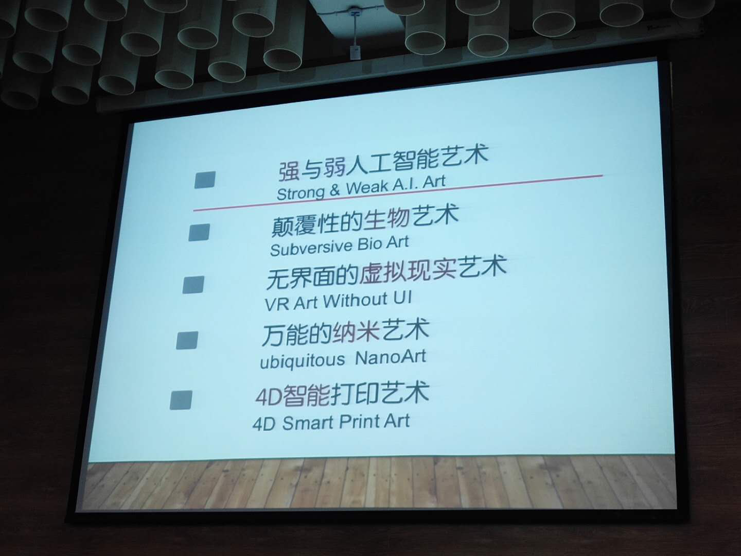 讲座共分为五部分:I艺术家生命体重构、II艺术生态环境重构、III艺术工具材料重构、IV艺术创造力重构、V艺术与美学范围定义重构。谭教授提出 “未来指导现在”的艺术创作观点,并指出,科技作为一种技术手段,越来越普遍地融入到艺术创作的领域当中,VR、AR 、MR虚拟技术乃至人工智能都与艺术有着千丝万缕的关联。当科技智能接近或超越人类智慧状态时,其艺术家生命体、艺术工具材料、艺术架构定义以及创作美学内涵,都面临解构再重构的必要性。