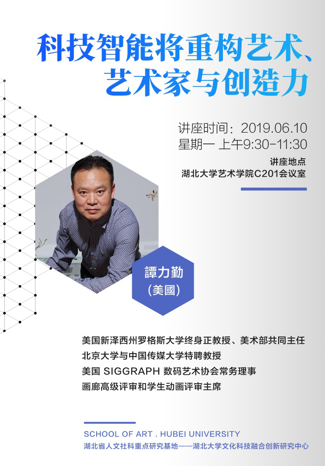 2019年6月10日上午,美国新泽西州罗格斯大学终身教授和美术部共同主任,谭力勤教授到湖北大学为艺术学院的师生作了题为“科技智能将重构艺术、艺术家和创作力”的专题学术讲座,探讨未来艺术在科技奇点冲击下的蜕变,美国媒体称他“革命性的艺术家”。主题演讲由动画与数字媒体艺术系主任、湖北省人文社科重点研究基地——文化科技融合创新研究中心主任余日季教授作学术主持。