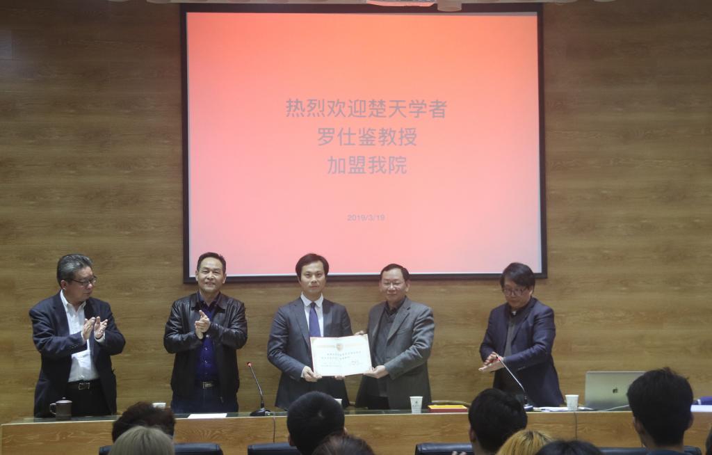 2019年3月19日下午,浙江大学工业设计系副主任,博士研究生导师罗仕鉴教授受聘为湖北大学楚天学者讲座教授。湖北大学副校长王世敏教授和人事处刘晓波处长为罗仕鉴教授颁发了楚天学者聘任证书,刘处长代表湖北大学欢迎和感谢罗教授的加盟。罗仕鉴教授衷心感谢了学校领导的信任与关怀,表示将不辱使命,努力完成好楚天学者讲座岗位的任务。