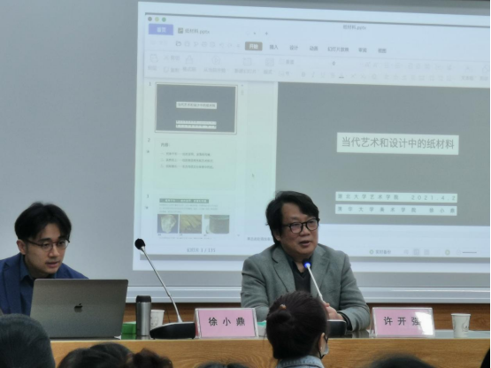徐小鼎教授的讲座分为三部分。第一部分内以“纸寿千年——纸的发明、发展和传播”为题,徐小鼎教授简单介绍了纸的发明、发展和自然形成。第二部分:跃然纸上——纸的物质特性和自然形成,纸可以运用于平面绘画、书法和拼贴艺术,也可以运用于二维的纸雕和剪纸、三维立体的纸雕塑和纸装置以及综合的书籍艺术。将纸的自然属性,心理属性,文化属性作了详细论述,通过鲜活有趣的名家名作展呈了三个属性所赋予设计师和艺术家的灵感的思维路径。同时,纸艺与计算机编程和当代艺术的结合组变出的新样式让人叹为观止。