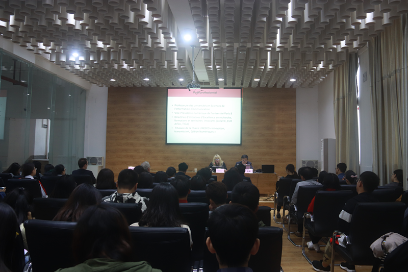 2018年10月16日至17日,联合国教科文组织“数字创新、传播与编辑”教席教授、法国社会科学院副院长、巴黎第八大学副校长AZEMARD Ghislaine(茜斯莲娜•阿则玛赫)应邀在艺术学院开展了为期两天的学术交流活动,AZEMARD Ghislaine教授是新媒体与数字传播领域的世界顶级科学家。在学术交流活动期间,校党委书记尚钢、人事处处长刘晓波、艺术学院党委书记黄家发、院长许开强和相关专业师生出席了AZEMARD Ghislaine教授受聘我校客座教授的聘任仪式。我校新闻传播学院、武汉纺织大学艺术与传媒学院和湖北工业大学艺术设计学院等相关专业负责人也参加了此次学术交流活动,学术活动由许开强院长主持,广州美术学院张啸博士担任现场翻译。