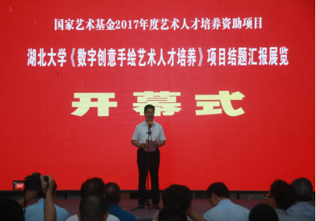 8月27日,由国家艺术基金资助、湖北大学主办的国家艺术基金2017年度人才培养资助项目——湖北大学数字创意手绘艺术人才培养项目项目结题汇报展在湖北省图书馆开幕。湖北省文化厅李耀华副厅长、文艺处管成文处长、田松处长、肖华慧处长、湖北省图书馆贺定安书记、王涛副馆长、湖北省美术家协会刘春冰秘书长、湖北省美术家协会副主席、湖北大学名誉院长董继宁、楚天传媒周洁董事长、湖北大学钱建国副校长、江汉大学美术学院王心耀院长、武汉纺织大学传媒学院沈祥胜院长、武汉插画人张蘶董事长以及承办单位湖北大学艺术学院黄家发书记、许开强院长、项目主持人李碧红教授、项目授课教师代表和学员代表等出席展览开幕仪式。