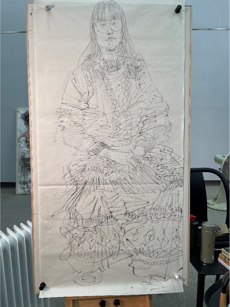 12月4日上午,蒙古族女青年水墨人物写生示范,用时约100分钟。任教授在写生示范后的互动中表示:写生,是经营探索的过程,是“一生二,二生三,三生万物”的过程。按部就班地套模式是没有意义的。探索适用于新鲜对象的新的笔墨设计,或许一开始表现的并不顺利,但是只要去思考分析就能够从中悟出一些道理。