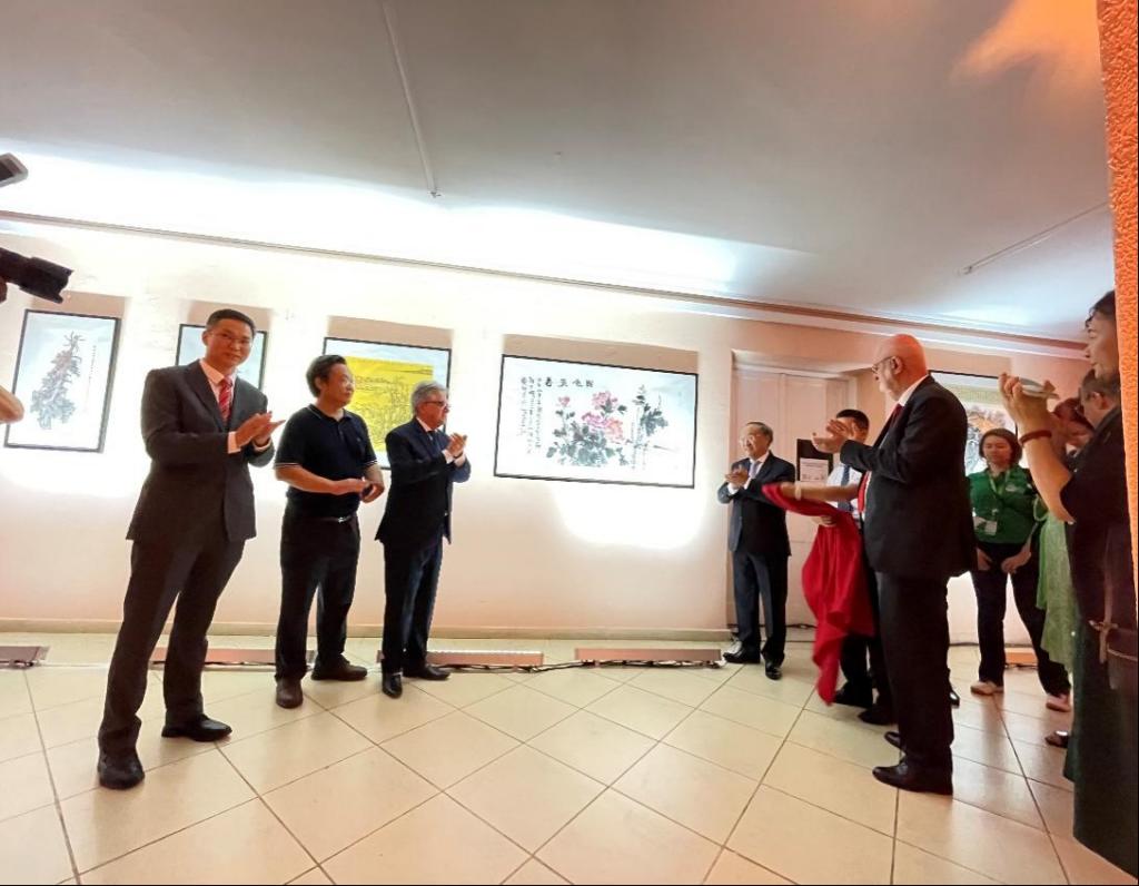 书画展开幕式上,校党委书记谢红星、圣保罗州立大学校长帕斯卡·巴雷蒂共同为谭崇正教授的作品《国色天香》捐赠仪式剪彩。邓鸿涛副教授在致辞表示,圣保罗州立大学具有深厚的文化底蕴、悠久的办学传统、广泛的社会赞誉,孔子学院的建设为中巴两国的文化互学互鉴提供了重要窗口和平台,此次水墨画展将有利于促进两国文化交流。