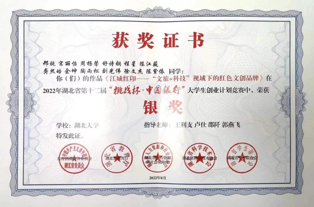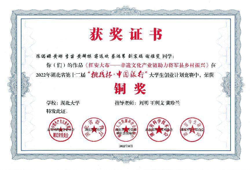 近日,学校发文表彰2022年“挑战杯”获奖集体和个人。在由共青团湖北省委、湖北省教育厅、湖北省人社厅、湖北省科学技术协会、湖北省学生联合会主办的湖北省第十二届“挑战杯·中国银行” 大学生创业计划竞赛中,艺术学院王利支老师团队创作的《江城红印---“文旅+科技”视域下的红色文床品牌》获得省级银奖;王利支老师团队参与的《红安大布---非遗文化产业链助力将军县乡村振兴》获得省级铜奖。