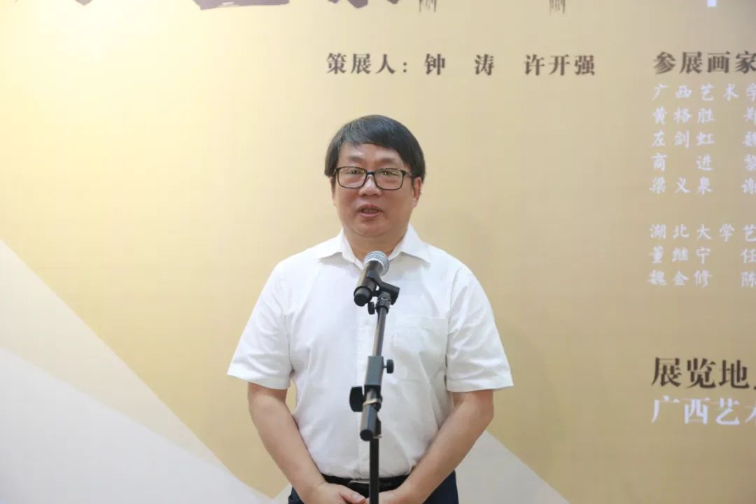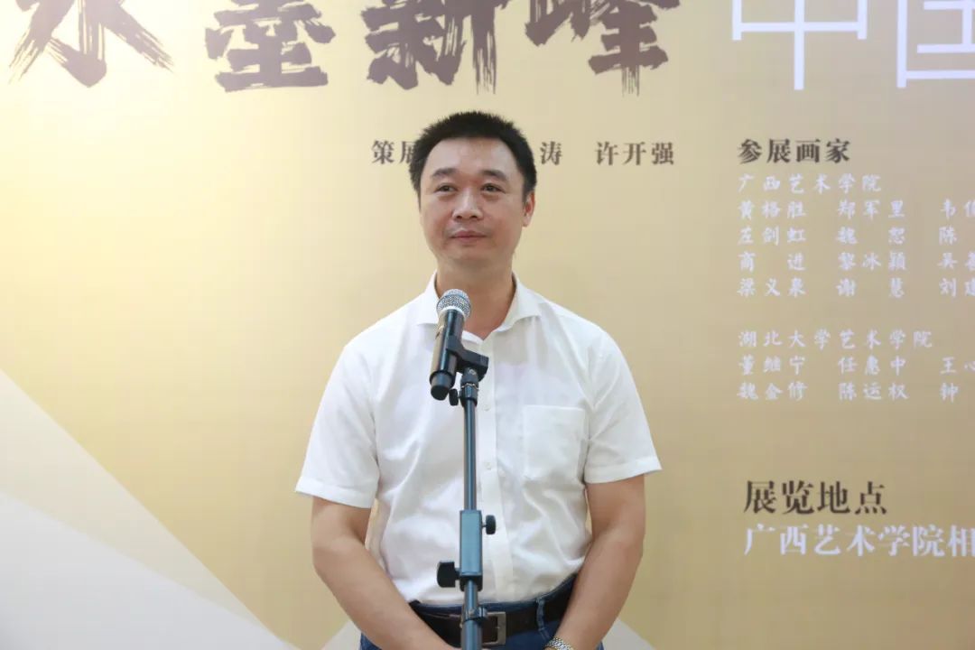 中国画学院/漓江画派学院院长钟涛教授教授对莅临画展的领导、嘉宾、同学们表示热烈欢迎,并表示此次展览首先为即将到来的中国共产党生日献礼,湖北、广西的艺术家通过精心创作的艺术作品,丰富人民的生活和校园文化,也是践行“为人民服务”宗旨的切实体现,并将稳固推进两地高校联合办展机制。相信通过此次联展及学术活动,能为两地艺术高校创作带来新的灵感,为两地高校的艺术教学带来新的思路,加强湖北、广西高校的链接,达到学院水墨“新高峰”!