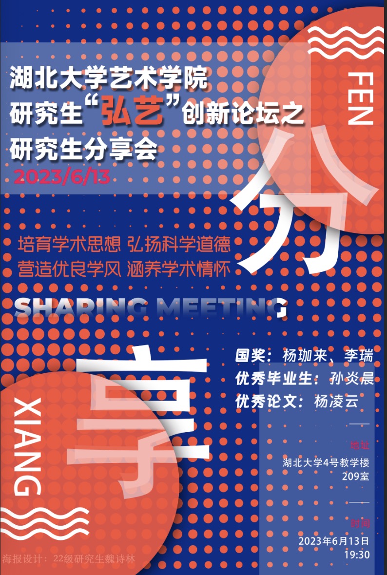 为培育学术思想,弘扬科学道德,营造优良学风,涵养学术情怀,学院开办研究生“弘艺”创新论坛系列活动。6月13日,第一期研究生“弘艺”创新论坛之“优秀研究生分享会”第一期活动在4号教学楼201教室顺利举办。本期活动在线上和线下同步进行,国家奖学金获得者、2020级美术学专业杨珈来,2020级数字媒体艺术专业李瑞同学,优秀毕业生2020级环境设计专业孙炎晨,优秀论文获得者、2020级视觉传达设计专业杨凌云同学等四位优秀研究生代表参加会议,分享了各自的学习心得和宝贵经验。