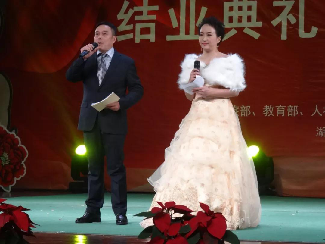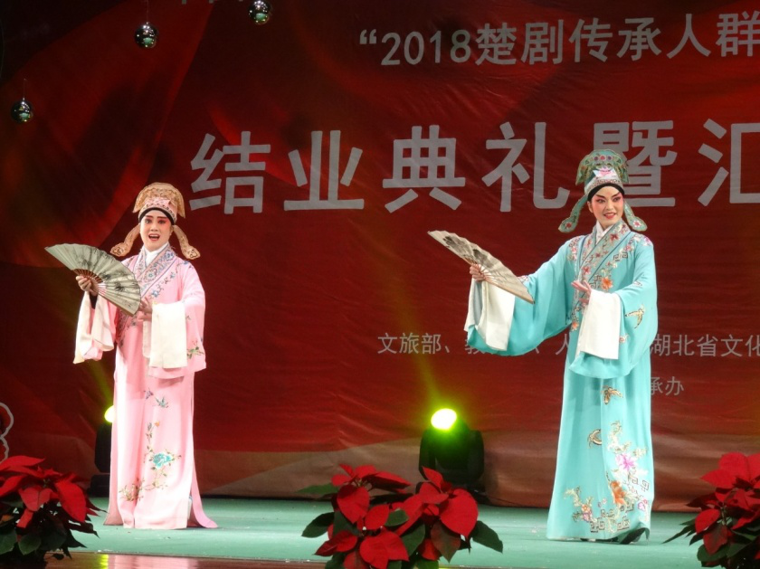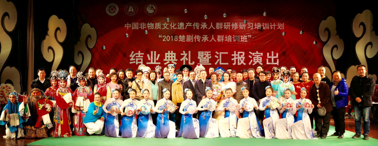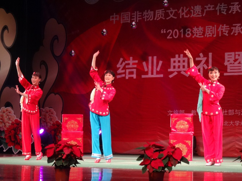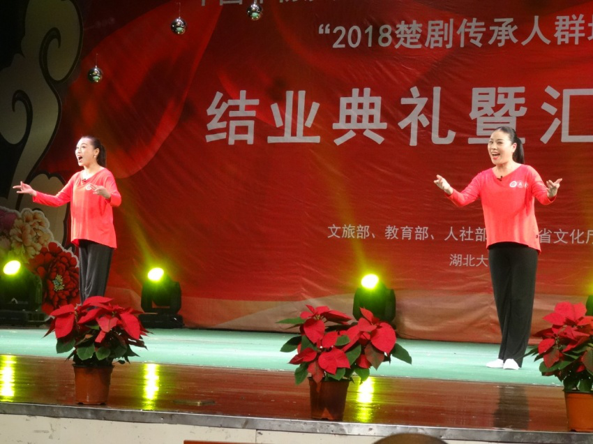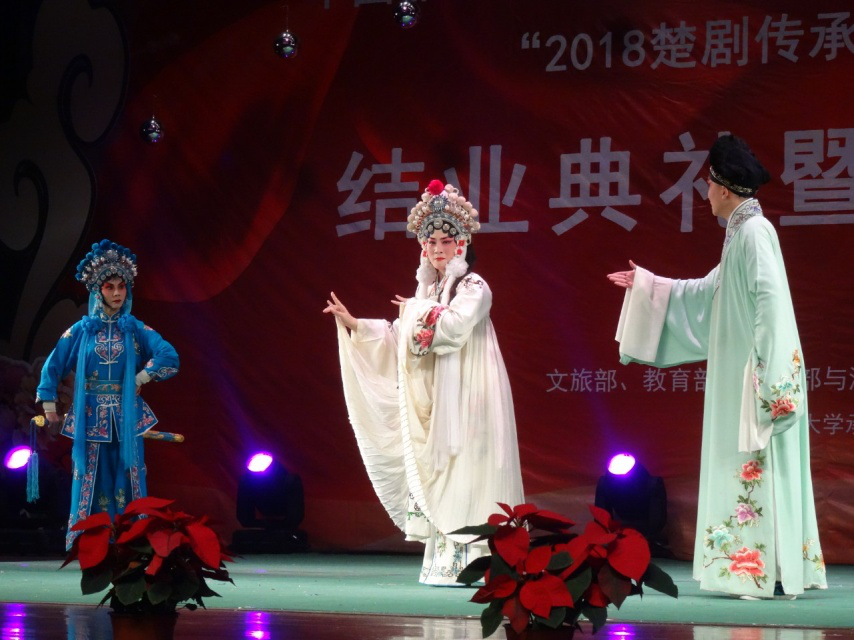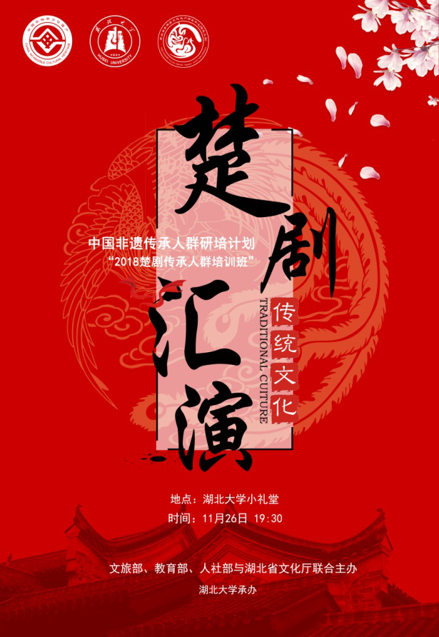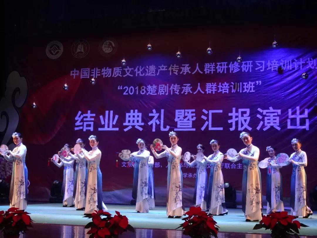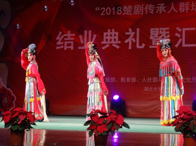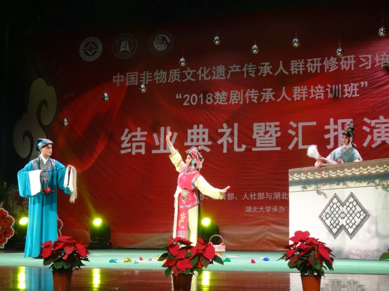11月26日19:30,在湖北大学小礼堂举行了“2018楚剧传承人群培训班结业典礼暨汇报演出”。湖北大学党委书记尚钢,湖北省文化厅非遗处负责人黄树清,红安县文化新闻出版广电局局长罗少鹏、副局长黄晓东,以及武汉楚剧院院长王文华,“文华奖”获得者刘丹丽,国家级楚剧非遗传承人张一平,“梅花奖”获得者夏青玲、詹春尧等专家出席了本次活动。