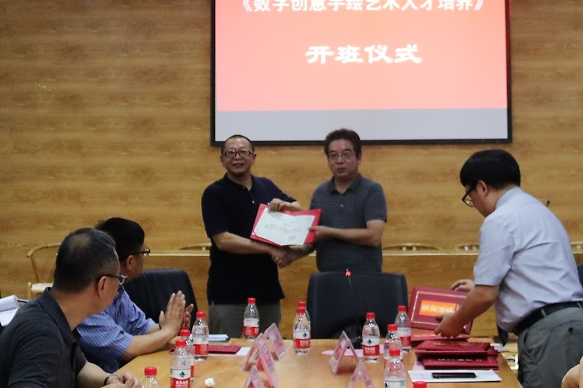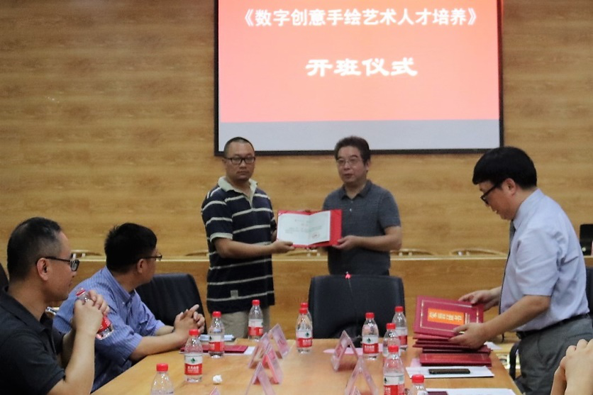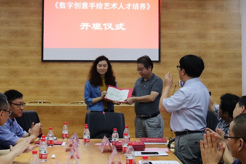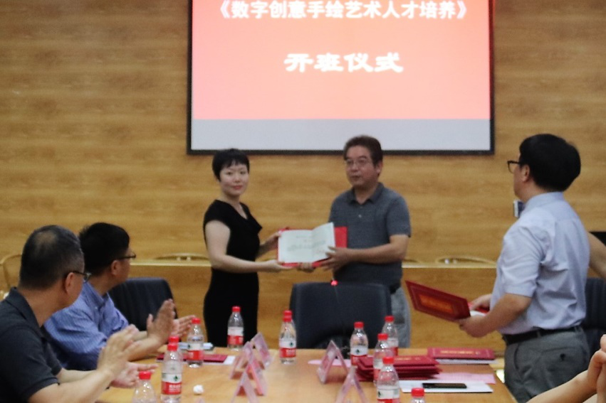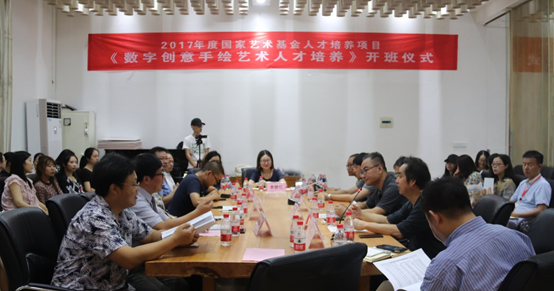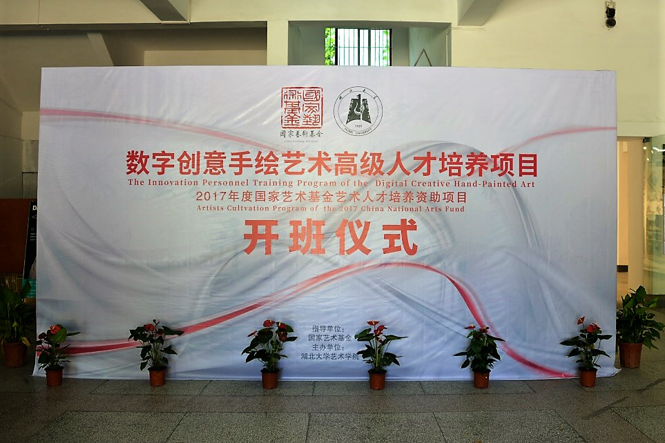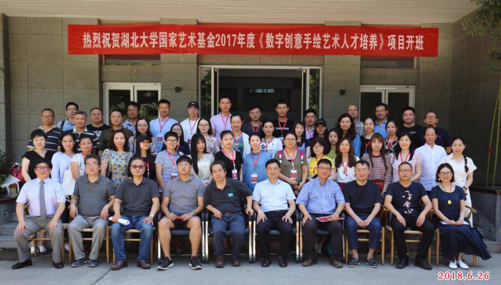 6月26日,由我校艺术学院承办的国家艺术基金2017年度人才培养资助项目“数字创意手绘艺术人才培养”正式开班。湖北大学副校长顾豪爽教授、湖北省文化厅文艺处处长田松先生、华中师范大学美术学院院长徐晓庚教授、武汉纺织大学传媒学院院长沈祥胜教授、湖北美术学院工业设计系主任李梁军教授、湖北工业大学设计学院院长石元伍教授、湖北大学社科处黄江英副处长、湖北大学艺术学院黄家发书记、许开强院长、马新平副院长、潘峰副院长以及武汉大学翁子扬教授、武汉纺织大学传媒学院叶科教授、中南财经政法大学新闻与传播学院动画系主任吴博教授、武汉工商学院艺术与设计学院数字媒体艺术系主任徐郑冰教授、武汉插画人辰星动漫CEO张巍先生、湖北大学尹朝阳教授、谭崇正教授、李钢教授、余日季教授、杨帆教授、王红教授、张立教授、彭茹娜教授、郑林教授、刘靖戎教授、杨高钰教授、李晶涛老师、向垚老师等数字手绘艺术领域的资深专家导师出席。