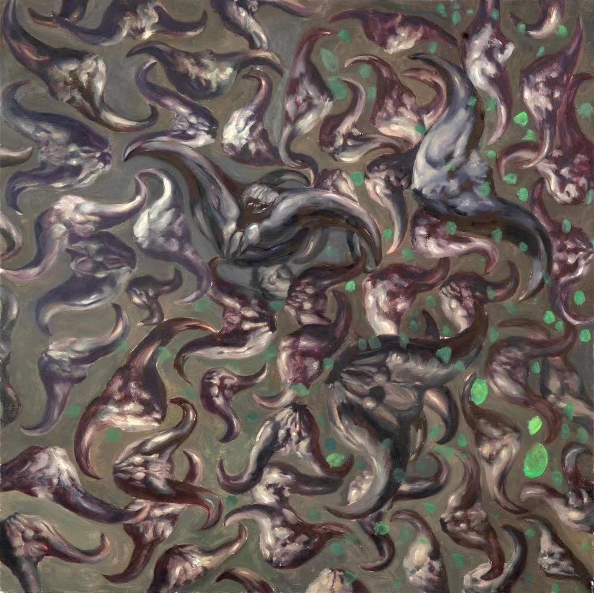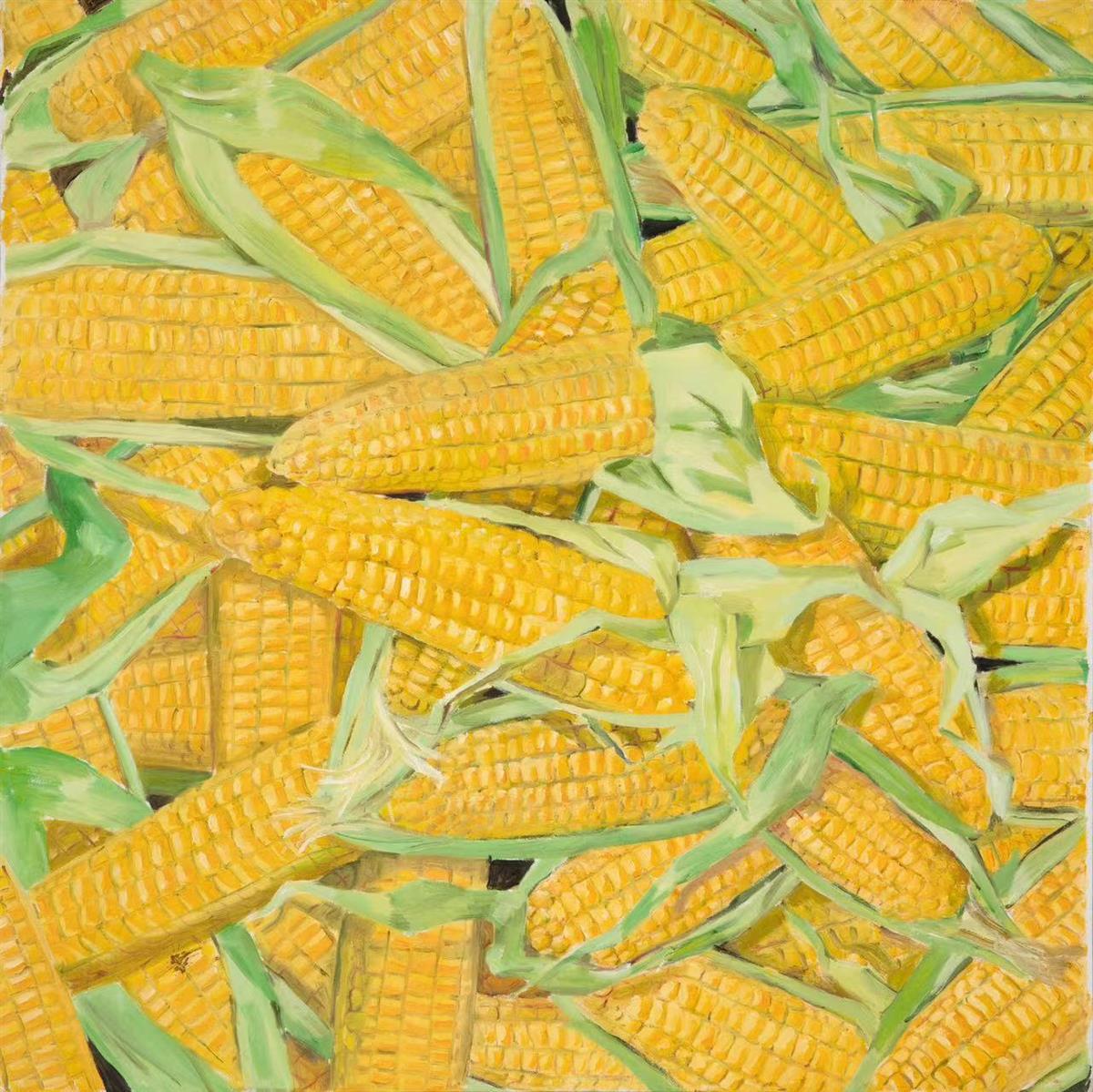 李碧红将五颜六色的它们一一呈现在画布上。《丰硕》由9幅油画组成,每一幅描绘一种蔬菜,红色的辣椒、橙色的南瓜、黄色的玉米、绿色的白菜、青色的丝瓜、蓝色的甘蓝、紫色的茄子、黑色的菱角、白色的萝卜。《橙与蓝》则为橘与蓝莓,《黄与绿》为梨与苹果,等等。“每张面孔都是那么的熟悉,味道也是那么的熟悉。”
