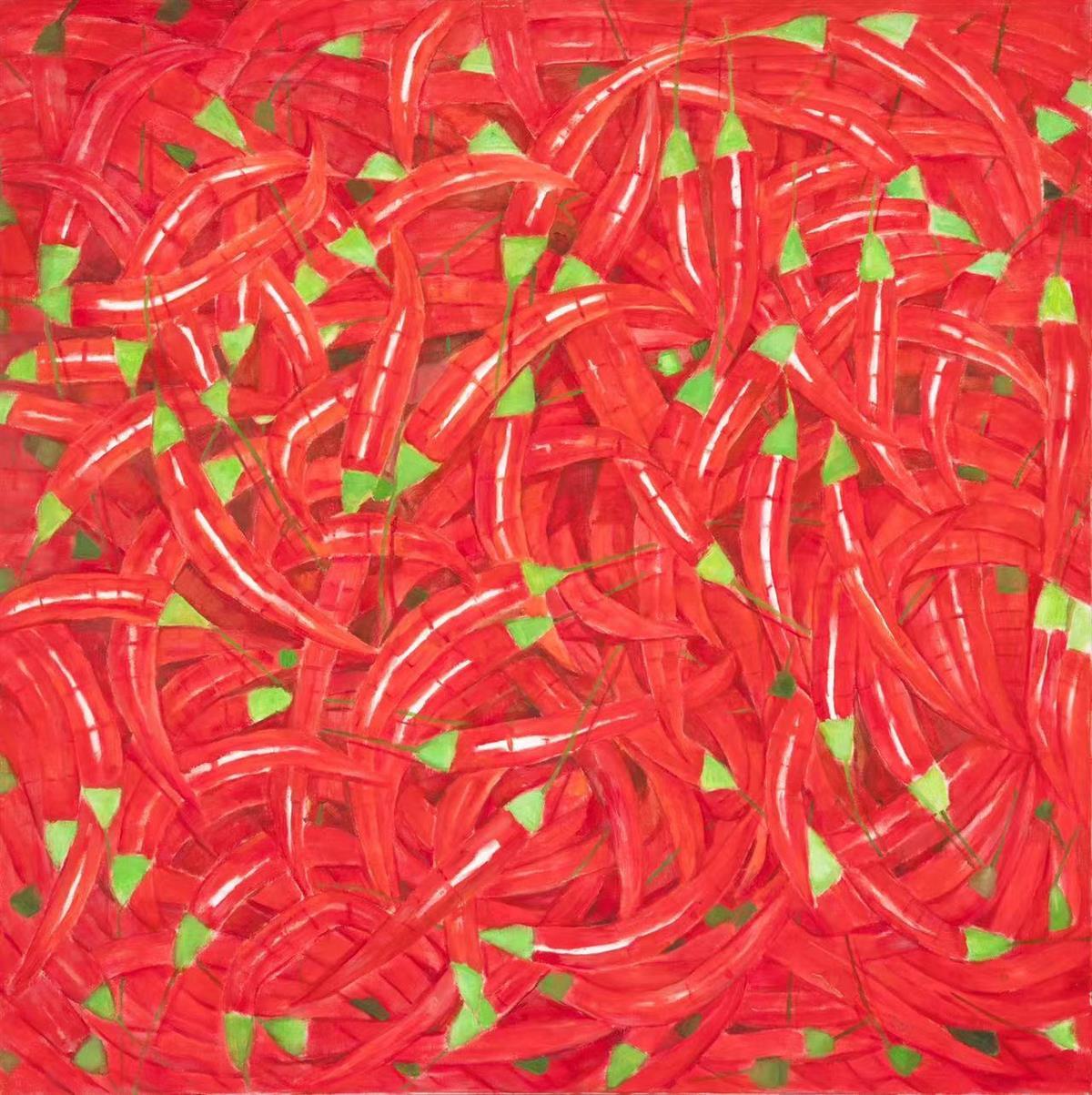 “红、橙、黄、绿、青、蓝、紫、黑、白,呈现出饱和色彩的果蔬,有种来自于大自然的力量感,雄壮而充实。我采用大自然给予果蔬的色彩,进行艺术的科学梳理,创作出《红与橙》《黄与绿》《红、黄、蓝》《丰硕》等作品。每种构成的色彩都是一次生命的颤动与洗礼,值得我们去尊重与敬畏。”湖北大学艺术学院美术系油画专业教授、硕士生导师李碧红说。