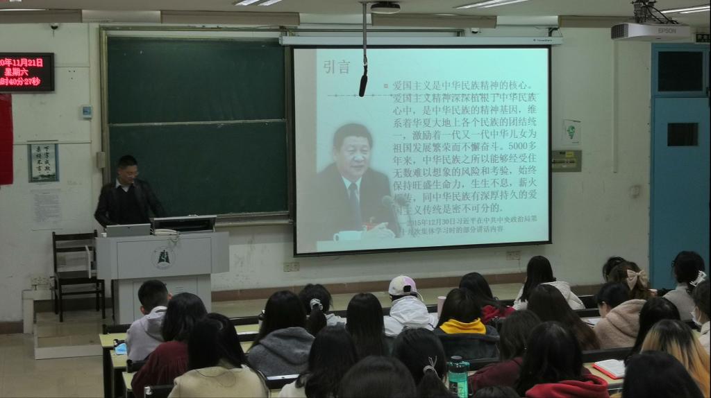 11月21日下午,化学化工学院党委副书记刘怀元以“做忠诚的爱国者”为主题进行了辅导报告。报告会上,他首先解释了爱国和爱国主义的内涵,以及爱国在中华民族的历史中的传承历程,向大家介绍了中国共产党历史上的爱国人士,并阐明了大学生弘扬爱国主义精神的重要性。接着,他还讲解了个人与国家的关系,强调爱国的重要性,并联系时事热点,谈到了香港问题、港珠澳大桥、南海问题等,指出爱国是中国人必备的精神品质。最后,刘怀元副书记着重就在座的青年大学生应该如何发扬自己的爱国主义精神作了阐述,即了解祖国历史,维护祖国统一,拥护党的领导,做忠诚的爱国者,立志成才报效祖国。他寄语全体学员,希望大家以建设祖国为目标,坚持努力,根据党章党规,规范自身的言行举止,承担社会责任,明确入党目标与态度,不忘初心,砥砺前行。