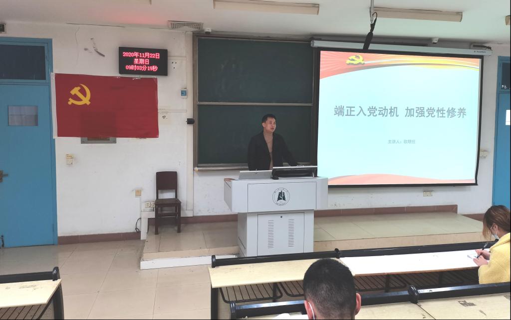 11月22号上午,艺术学院党委副书记欧明任以“端正入党动机 加强党性修养”为题作辅导报告。本次报告中欧书记结合世情党情国情和高等教育发展历程引领大家一起学习,事例鲜活,就入党动机的含义、入党动机类型、入党动机类型演变、影响入党动机的内外因素、端正入党动机的首要条件和如何端正入党动机进行了阐述。他向全体学员提出三点希望:一是要践行终身学习,认真地学习政治理论知识和习近平总书记系列重要讲话精神。二是要践行学以致用,自觉地在履行好学生职责中发挥好先锋模范作用;三是要践行完善发展,经常地对照党章和有关要求找差距,整改完善。