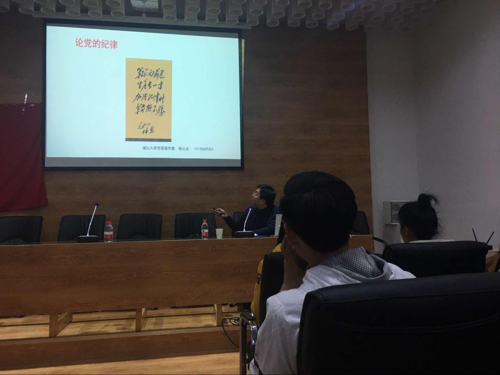 接下来,由湖北大学党委宣传部杨元业老师授课。杨老师首先从党的纪律着手引用了毛主席的一段话: