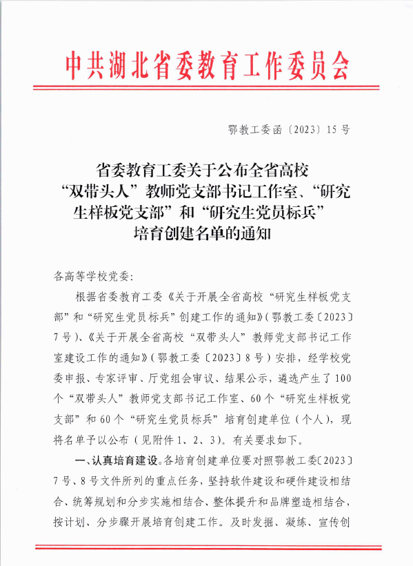 近日中共湖北省委教育工委公布了湖北省高校“双带头人”教师党支部书记工作室创建名单,我院视觉传达与产品设计教工党支部书记工作室成功入选。